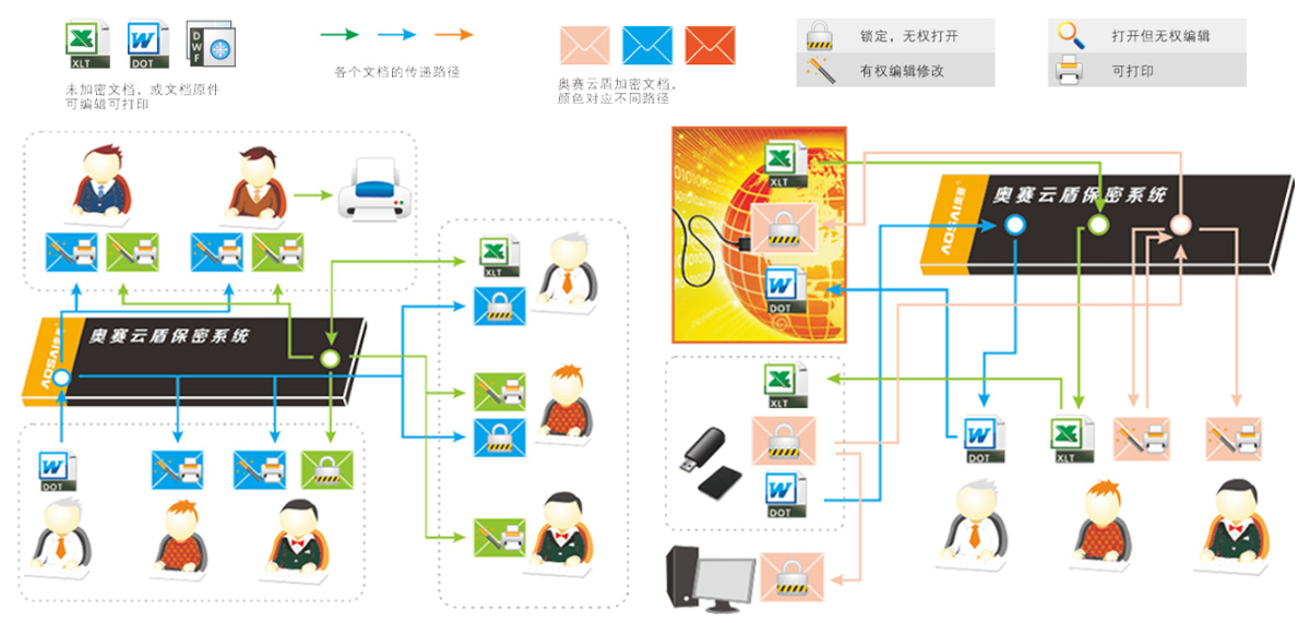 分別在財(cái)務(wù)部、技術(shù)部安裝客戶(hù)端,彼此的文檔互不相通。對(duì)于上級(jí)主管,比如管理部,則可以同時(shí)打開(kāi)雙方加密的文檔。