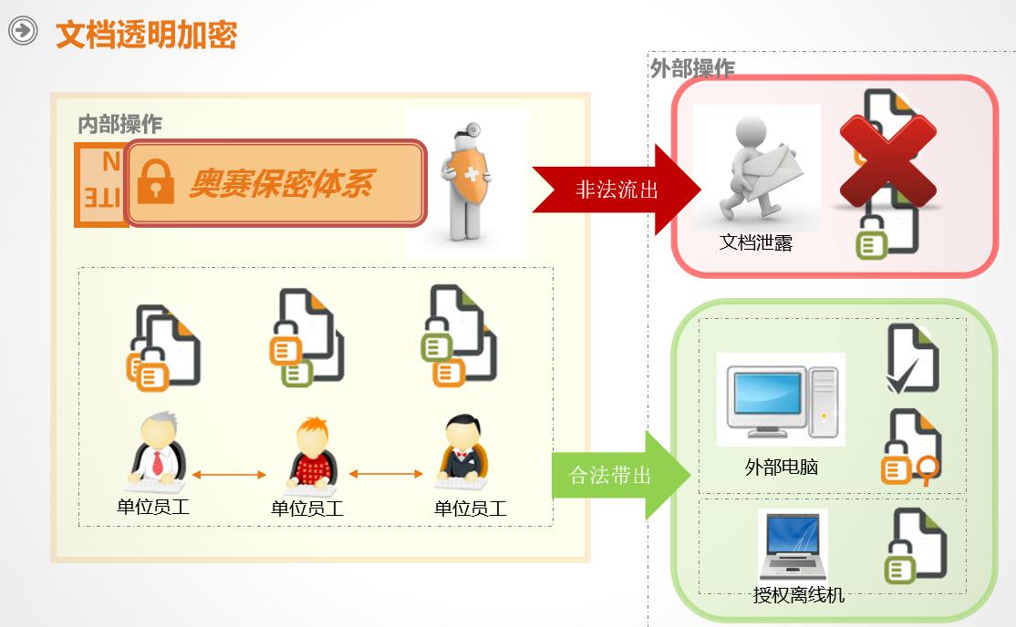 奧賽云盾采用先進的文件內(nèi)核加密技術(shù),在無需人工干預、不影響員工辦公的前提下對數(shù)據(jù)進行全程智能加密,在內(nèi)部環(huán)境可正常使用,脫離內(nèi)部授權(quán)環(huán)境則無法打開。根據(jù)實際業(yè)務(wù)需求可使用打開加密、修改加密、手動加密、智能加密等靈活多樣的加密策略。