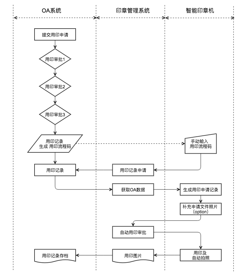 用戶(hù)的用印申請(qǐng)和審批流程在OA系統(tǒng)內(nèi)完成,審批通過(guò)后,與印章系統(tǒng)通過(guò)設(shè)定接口在服務(wù)管理后臺(tái)進(jìn)行通訊,將用印申請(qǐng)和審批的詳細(xì)內(nèi)容傳輸?shù)接≌孪到y(tǒng),并發(fā)送到智能印章機(jī)上。用印用戶(hù)在智能印章機(jī)上完成用印行為。通過(guò)標(biāo)準(zhǔn)通信接口的方式,智能印章系統(tǒng)和OA系統(tǒng)之間可以實(shí)現(xiàn)完美的對(duì)接,不但可以迅速完成整體部署,降低時(shí)間和開(kāi)發(fā)成本,而且可以有效降低用戶(hù)的學(xué)習(xí)成本。