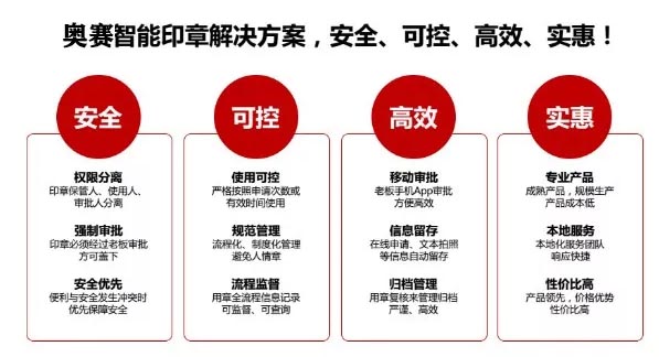 奧賽智能印章能高效解決政府部門、企事業(yè)單位印章管理難題:異地用章難管控、印章外帶不可控、公章私蓋難防范、印章使用缺記錄。