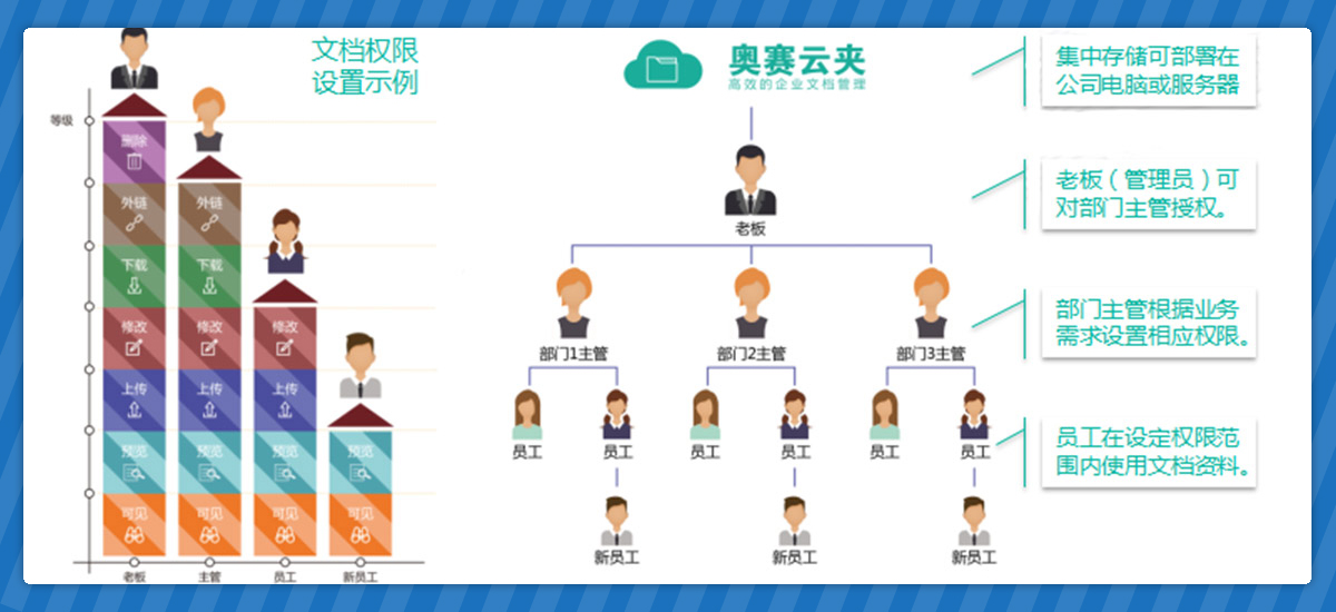 文件/文件夾,靈活設(shè)置。權(quán)限繼承,離職交接更快。多級(jí)管理員,管理更高效。