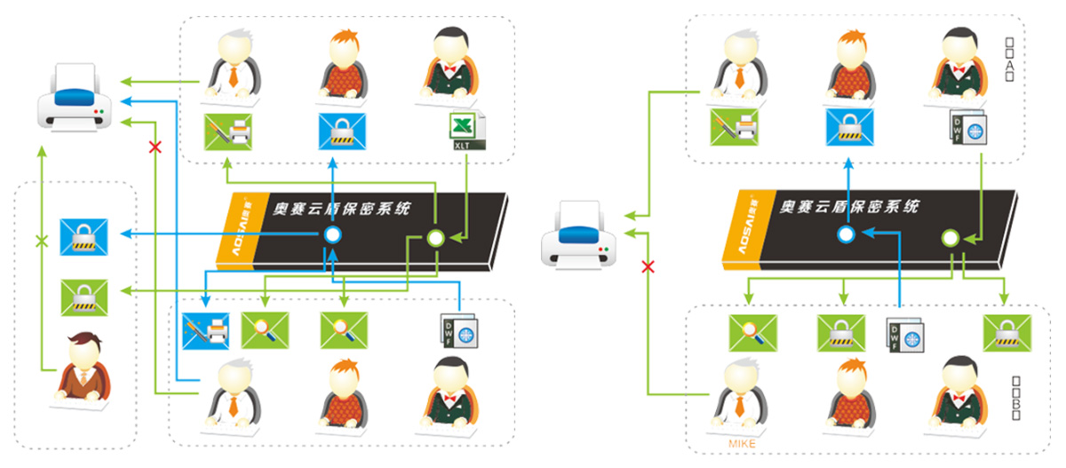 分別在財(cái)務(wù)部、技術(shù)部安裝客戶(hù)端,彼此的文檔互不相通。對(duì)于上級(jí)主管,比如管理部,則可以同時(shí)打開(kāi)雙方加密的文檔。