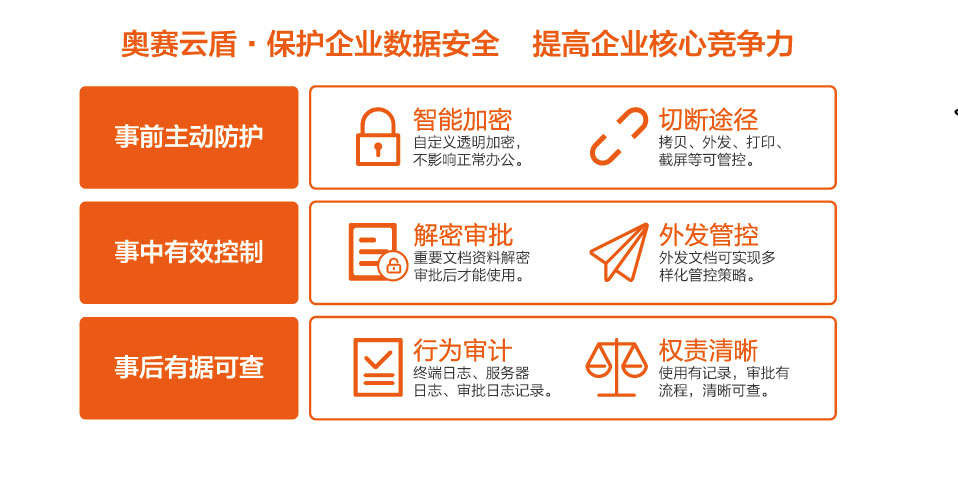 奧賽數(shù)據(jù)資產(chǎn)管理解決方案可以讓中佳華悅能夠?qū)崿F(xiàn)數(shù)據(jù)集中存儲(chǔ)、文件多重備份、文件安全加密、文檔外發(fā)管控等功能,有效地保護(hù)中佳華悅的專利、核心技術(shù)、研發(fā)成果,鞏固公司在行業(yè)里的競爭力。同時(shí)數(shù)據(jù)高速共享、文件自動(dòng)同步、上網(wǎng)行為規(guī)范等功能可以提高公司的工作效率,給公司帶來更高的效益,降低人力成本。