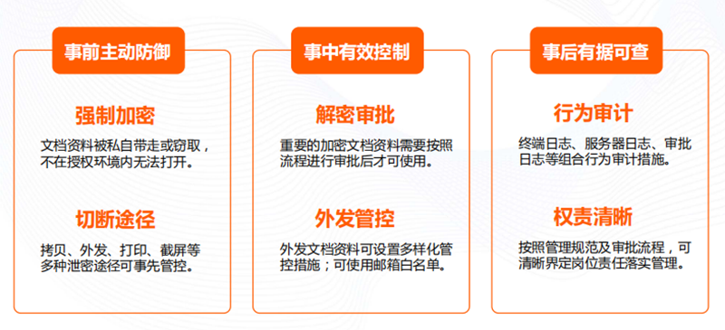 重要數(shù)據(jù)資料在加密基礎(chǔ)上,實(shí)現(xiàn)內(nèi)外部數(shù)據(jù)流轉(zhuǎn)管控。核心重要資料的非常規(guī)內(nèi)部使用,必須經(jīng)過解密審批或單獨(dú)授權(quán)。公司外部的流轉(zhuǎn)使用,可通過限定次數(shù)、限定時(shí)間、限定電腦、限定對(duì)象來進(jìn)行管控。
